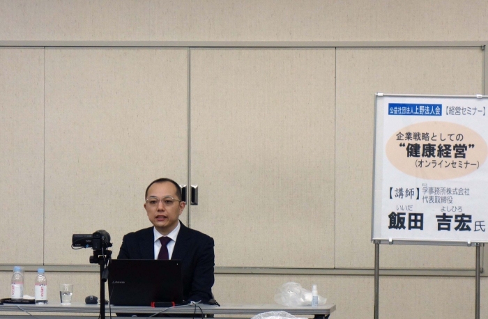 2022年02月21日更新 最新の活動報告 セミナー 【経営セミナー】企業戦略としての”健康経営” 2022年2月18日 13:30~ オンラインにて開催 経営セミナー「企業戦略としての健康経営」を開催しました。講師は孚事務所株式会社代表取締役の飯田 吉宏(いいだ よしひろ)先生です。昨今注目されている「健康経営」についてわかりやすく講義していただきました。