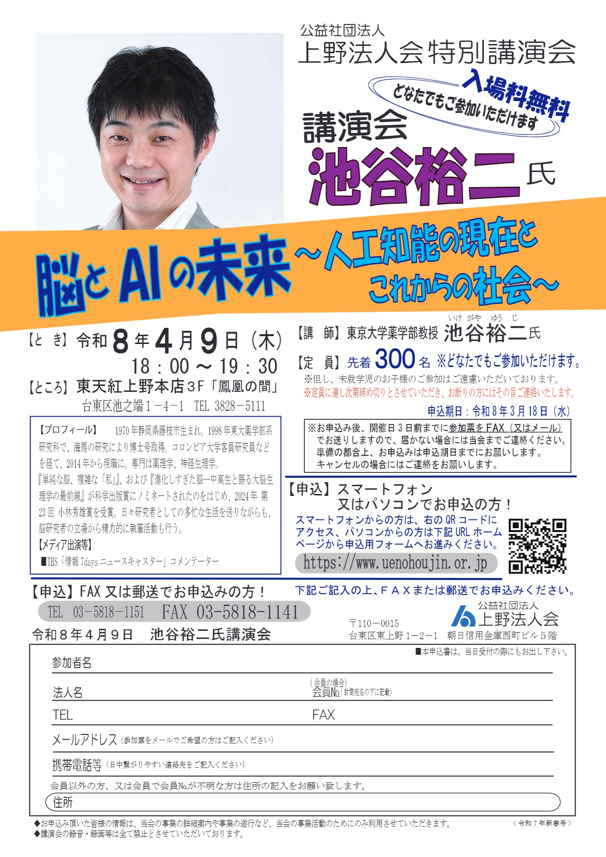 2026年04月09日更新 セミナー・講演会 特別講演会・「脳とAIの未来」~人工知能の現在とこれからの社会~ (公社)上野法人会・(公社)浅草法人会共催による、杉本昌隆氏講演会を開催します。 講師紹介 池谷 裕二 氏 東京大学薬学部教授 1970年静岡県藤枝市生まれ。1998年東大薬学部系研究科で、海馬の研究により博士号取得。コロンビア大学客員研究員などを経て、2014年から現職に。専門は薬理学、神経生理学。 『単純な脳、複雑な「私」』、および『進化しすぎた脳―中高生と語る大脳生理学の最前線』が科学出版賞にノミネートされたのをはじめ、2024年 第23回 小林秀雄賞を受賞。 日々研究者としての多忙な生活を送りながらも、脳研究者の立場から精力的に執筆活動も行う。