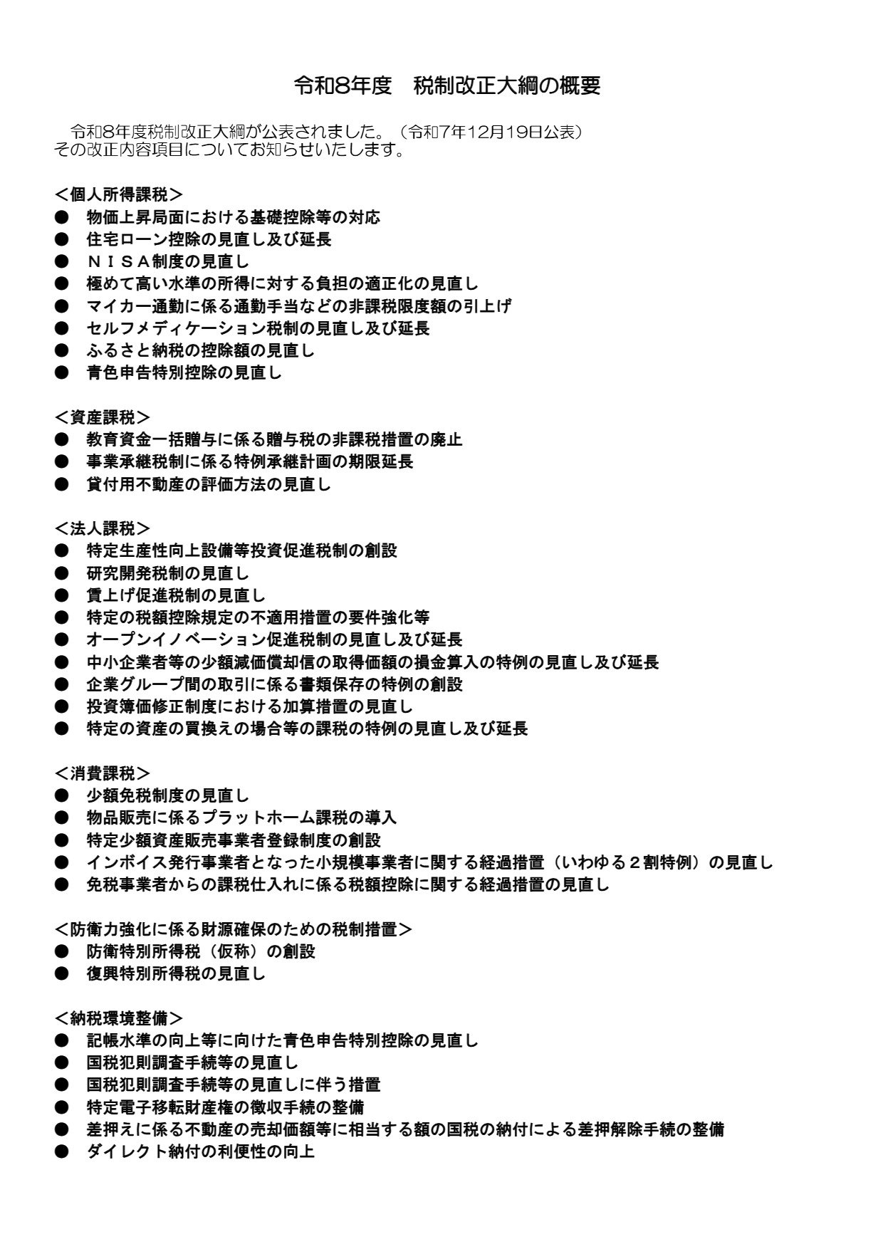 令和8年度税制改正大綱が公表されました。(令和7年12月19日公表)