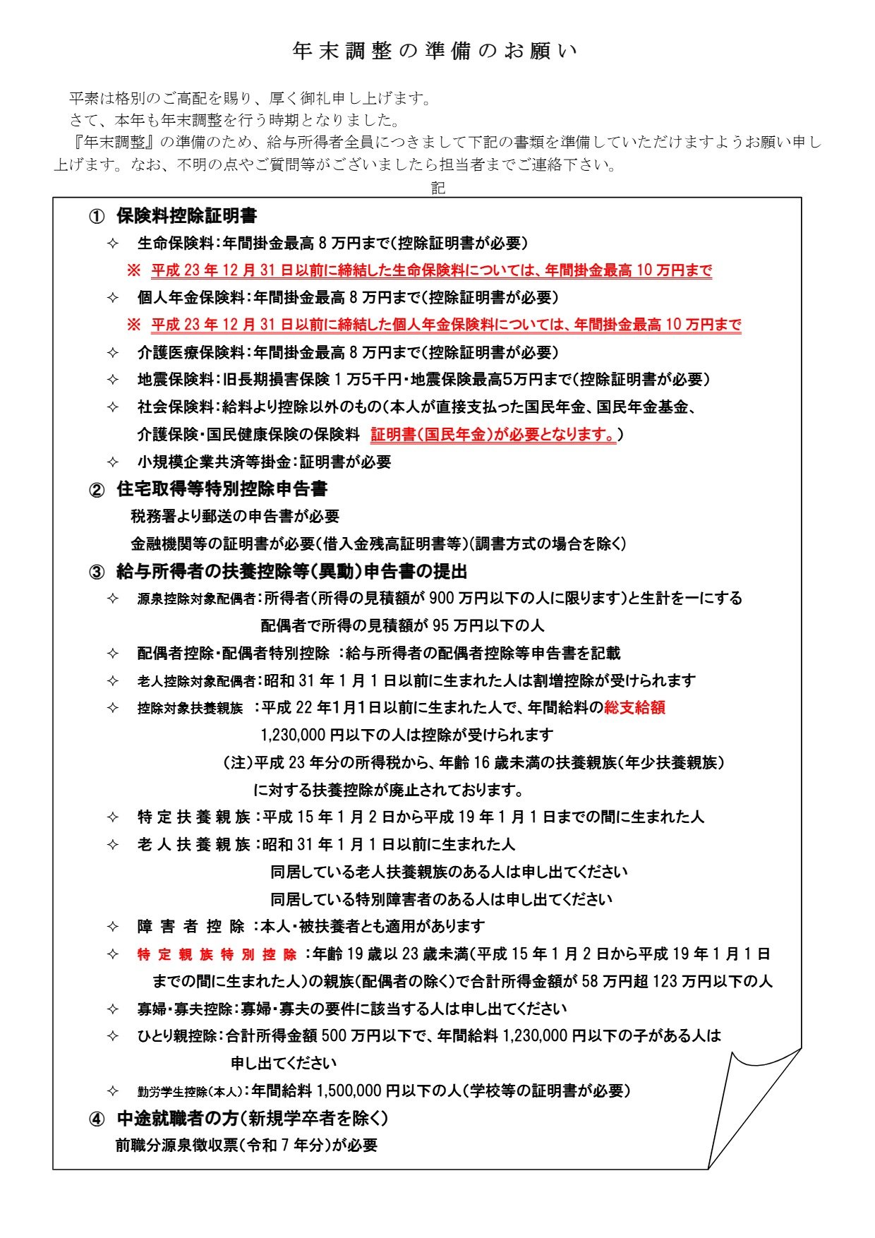 平素は格別のご高配を賜り、厚く御礼申し上げます。 さて、本年も年末調整を行う時期となりました。『年末調整』の準備のため、給与所得者全員につきまして下 記の書類を準備していただけますようお願い申し上げます。 なお、不明の点やご質問等がございましたら担当者までご連絡下さい。