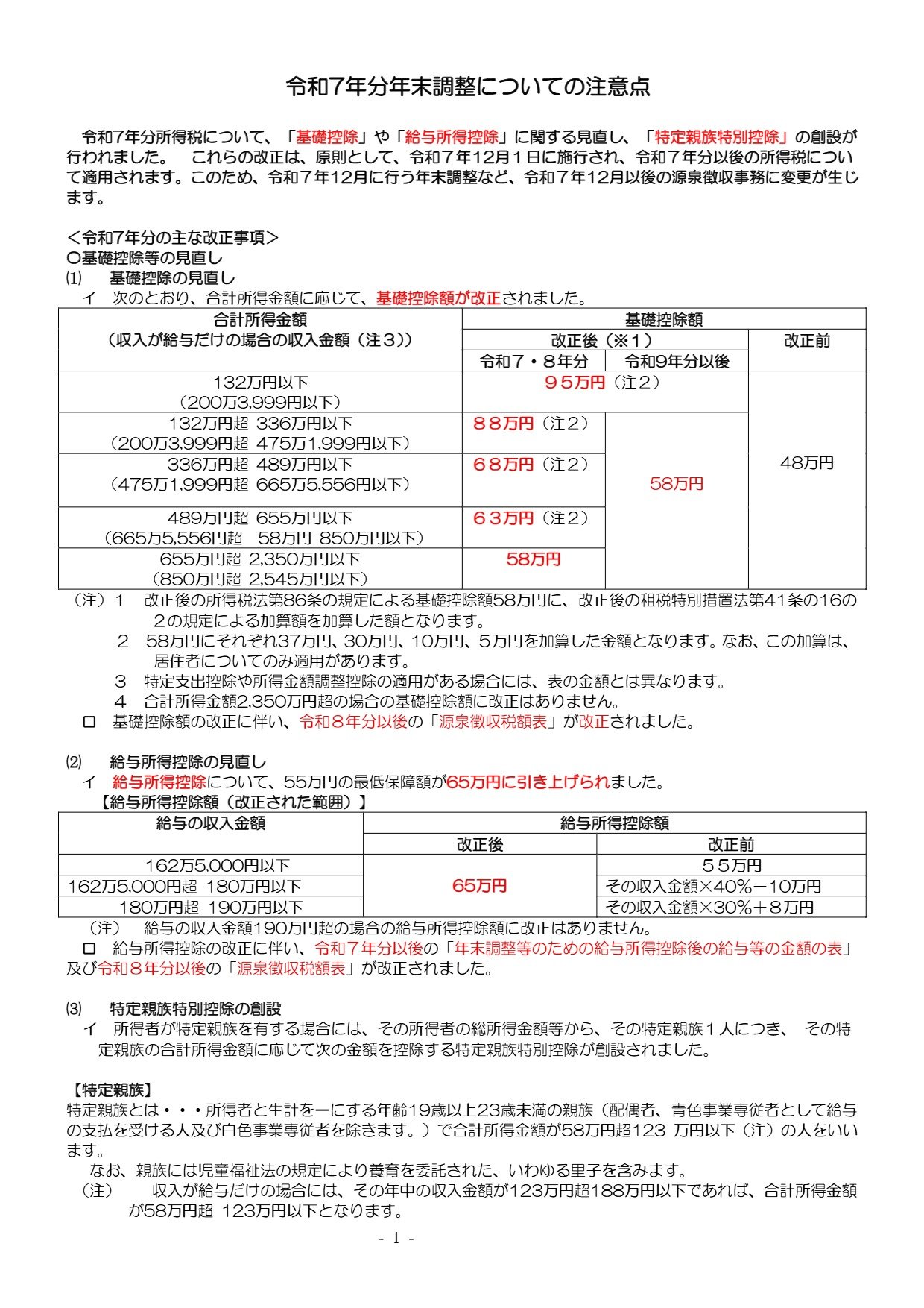 令和7年分所得税について、「基礎控除」や「給与所得控除」に関する見直し、「特定親族特別控除」の創設が行われました。 これらの改正は、原則として、令和7年12月1日に施行され、令和7年分以後の所得税について適用されます。このため、令和7年12月に行う年末調整など、令和7年12月以後の源泉徴収事務に変更が生じます。