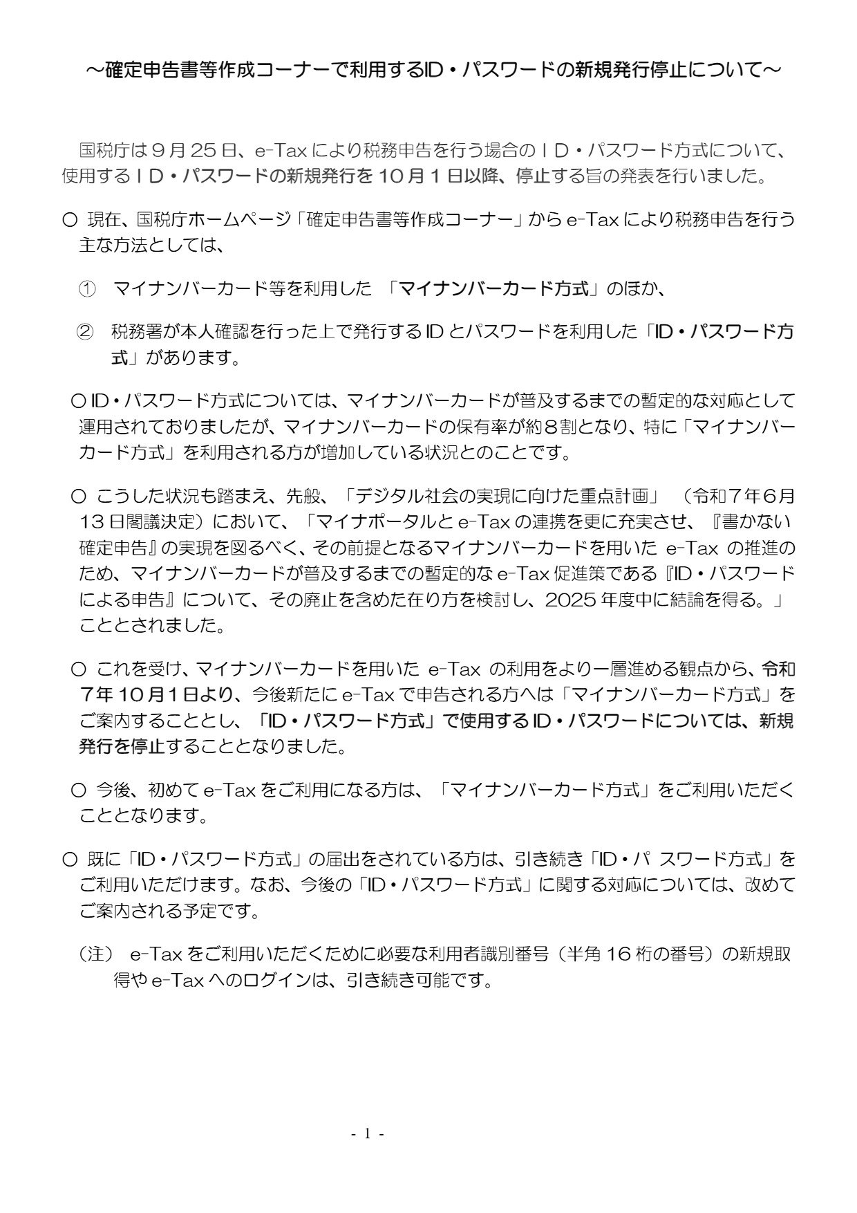 国税庁は9月25日、e-Taxにより税務申告を行う場合のID・パスワード方式について、使用するID・パスワードの新規発行を10月1日以降、停止する旨の発表を行いました。
