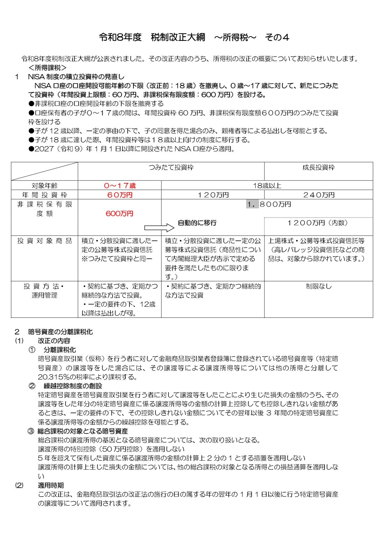 令和8年度税制改正大綱が公表されました。その改正内容のうち、所得税の改正の概要についてお知らせいたします。